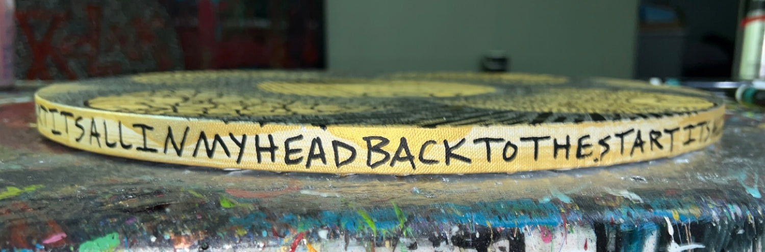 “BITTISHAM” 16” round canvas - gold / silver acrylic base with black acrylic paint pen topped with resin pour finish coat! This is a crazy cool painting that will be sure to have you and your friends staring for hours! Only 1 available