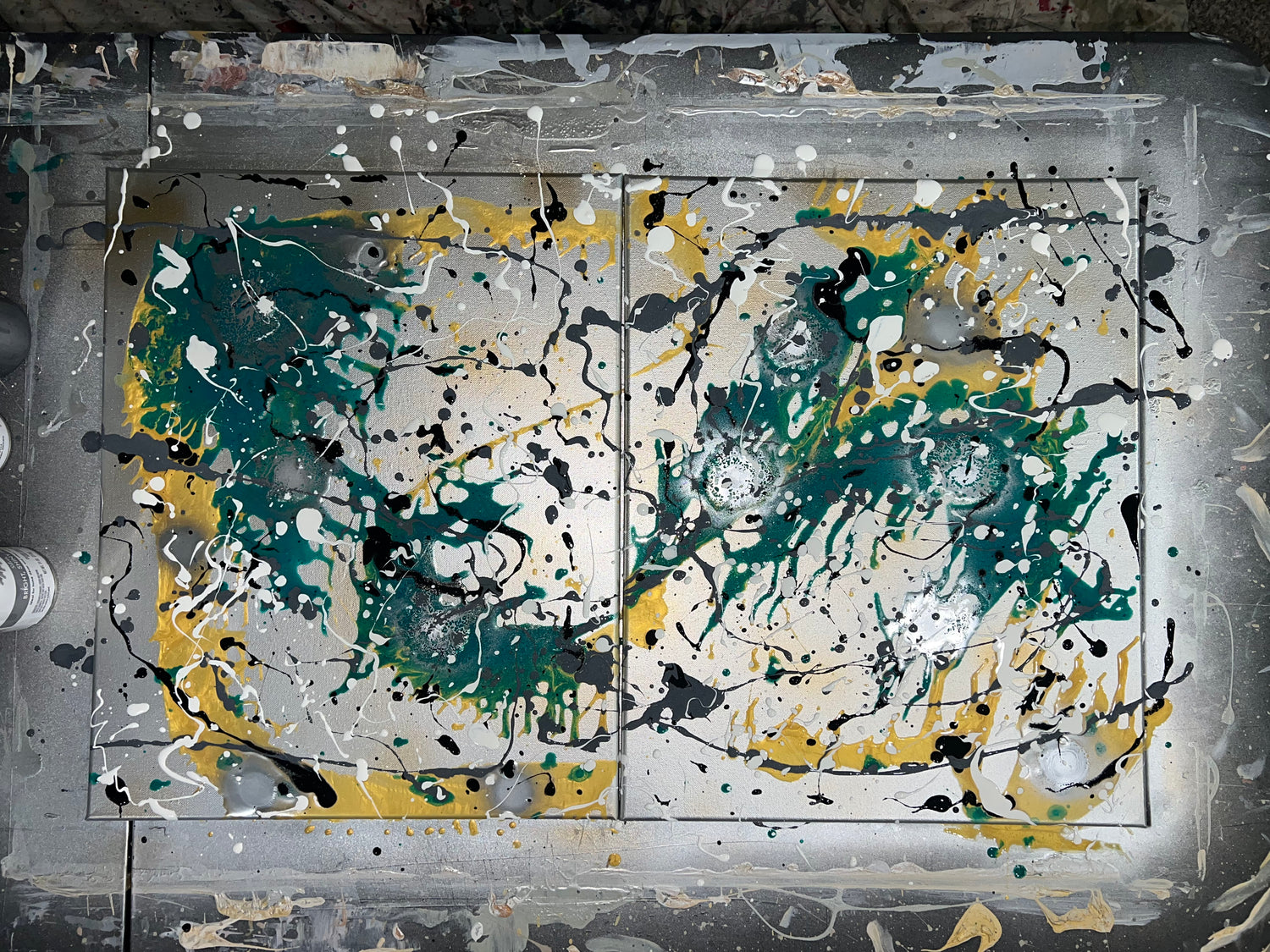2 16”x20” splattered canvases with acrylic paint. Completed 9/4/2022 by Adam Gilbert.