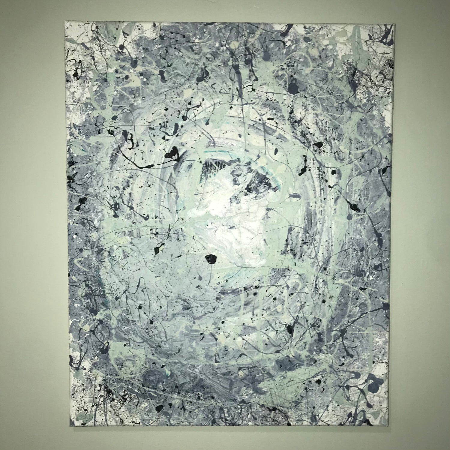 Custom splatter painting “FLATTEN” painted on 4/2/2022 by Adam Gilbert. Acrylic paint on 16”x20” canvas
