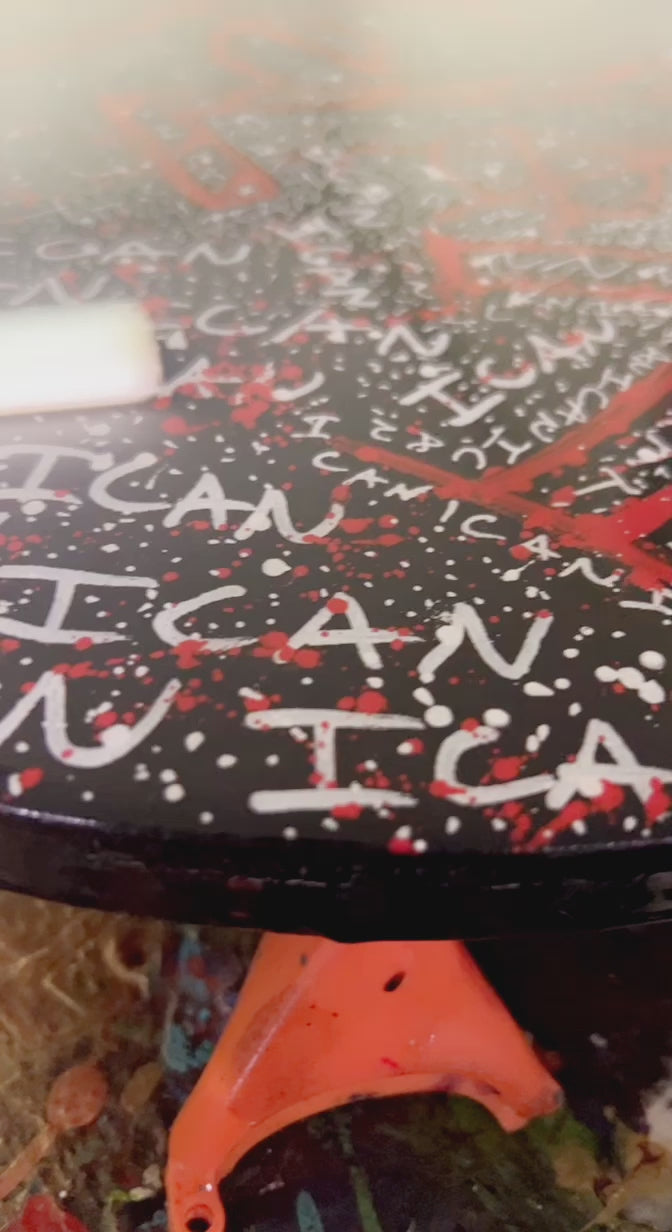 “ICANICANT” 16” round canvas - black acrylic base with white & red acrylic paint pen topped with resin pour finish coat! This is a crazy cool painting that will be sure to have you and your friends staring for hours! Only 1 available